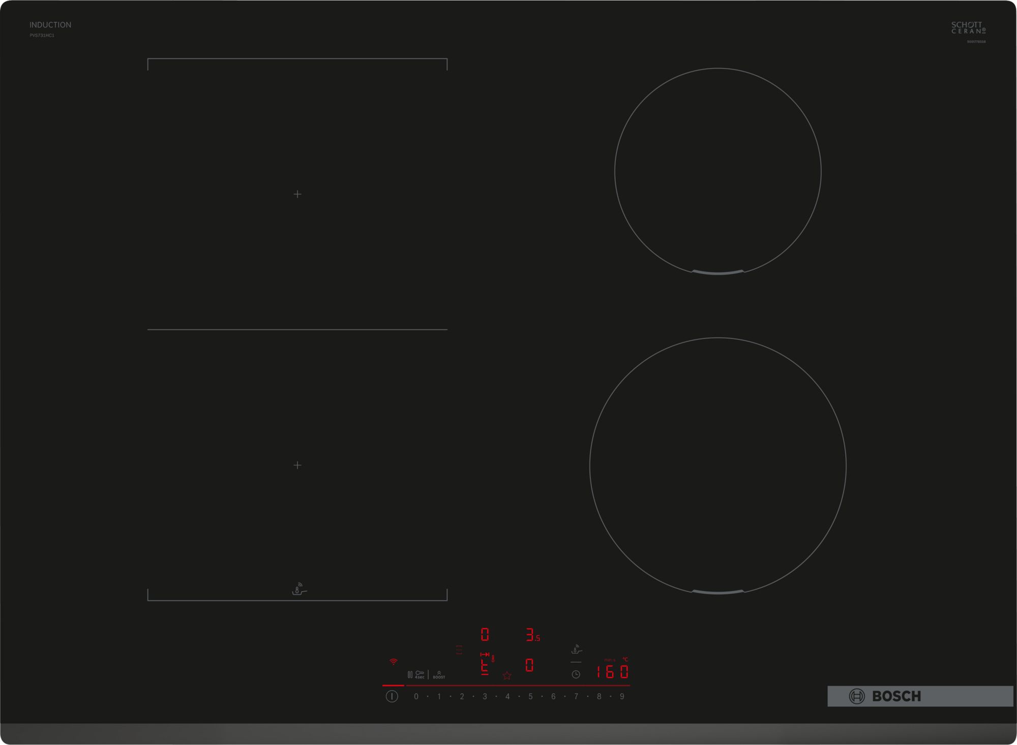 Especificaciones: Bosch – Placa de inducción Bosch Serie 6, 70 cm de ancho, PerfectFry Plus, Control placa-campana, CombiInducción, PVS731HC1E.